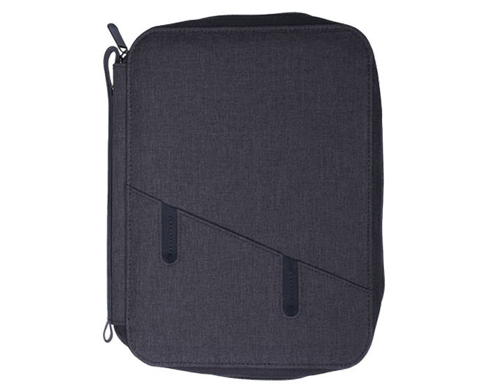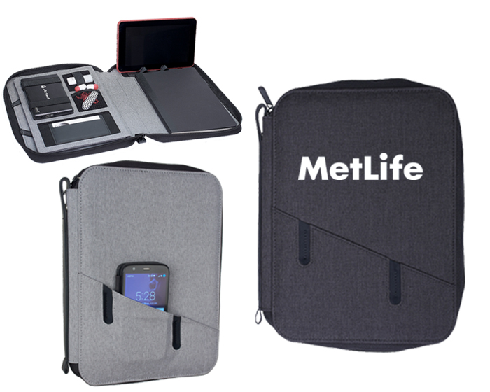 Moderna carpeta multiusos con cierre, con exterior e interior en tela. Incluye libreta tamaña A5 de 64 hojas rayadas (128 páginas). Cuenta con funda al frente para Smartphone, compartimento interior para tablet, 2 soportes ajustables portatablet o portacelular, cinta elástica para Smartphone y cinta elástica para memorias USB u otros accesorios, compartimento con ventana plástica para credenciales, divisiones para tarjetas, bolsa de malla, agarradera exterior con broche de presión, así como cinta elástica para fijar bolígrafo (no incluido).